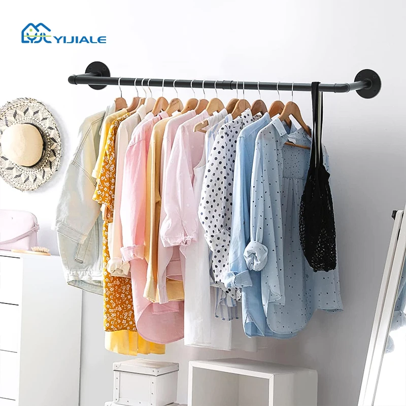 YIJIALE Heavy Duty Wall Mounted Black Iron Garment Bar Telescoping Wall Clothes Rack