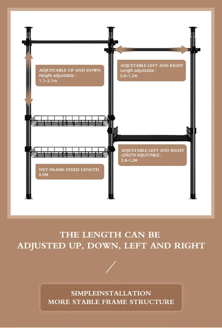 Spezifikation Modellnummer: 2L1H2N Durchmesser der senkrechten Röhre: 38mm Kombination: 2 senkrechte Stangen + 1 waagerechte Stange + 2 Netzrahmen Farbe: Schwarz/Weiß/Walnuss/Grau/Braun Dicke der Rohrwand: 0,9mm Tragfähigkeit einer einzelnen Stange: 80KG Material: C...