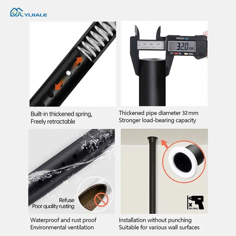 Verwendung: Dieses Produkt erfordert keinen elektrischen Bohrer zum Bohren von Löchern. Das Funktionsprinzip besteht darin, die Höhe anzupassen und sie durch das Festlegen der Federposition im Hauptstab zu verstärken, um eine stabile Unterstützung zu erreichen. Zuerst installieren wir die entsprechenden Zubehörteile auf dem Hauptstab, probieren die ungefähre Höhe von der Decke bis zum Boden aus und stellen die Federschraube dann auf eine Position ein, die eine Stufe höher als die tatsächliche Höhe ist. Zuerst drücken wir sie gegen die Decke, dann nach oben und positionieren den Boden, um ihn mit der Spitze auszurichten. Nachdem es festgelegt wurde, installieren wir die Zubehörteile.