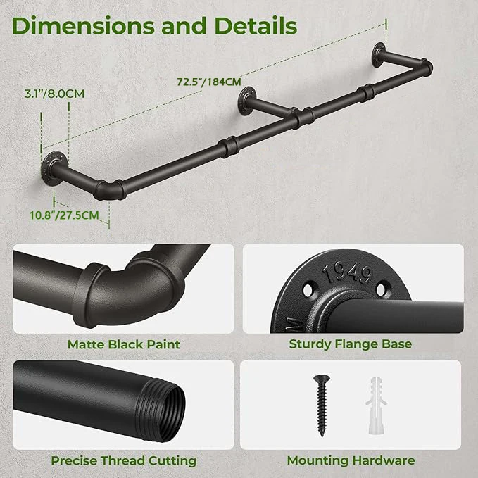 【RESISTENTE E DURÁVEL】 Feito de tubos de ferro pesados, este cabide para roupas é extremamente durável e pode suportar até 45kg quando instalado em uma parede sólida